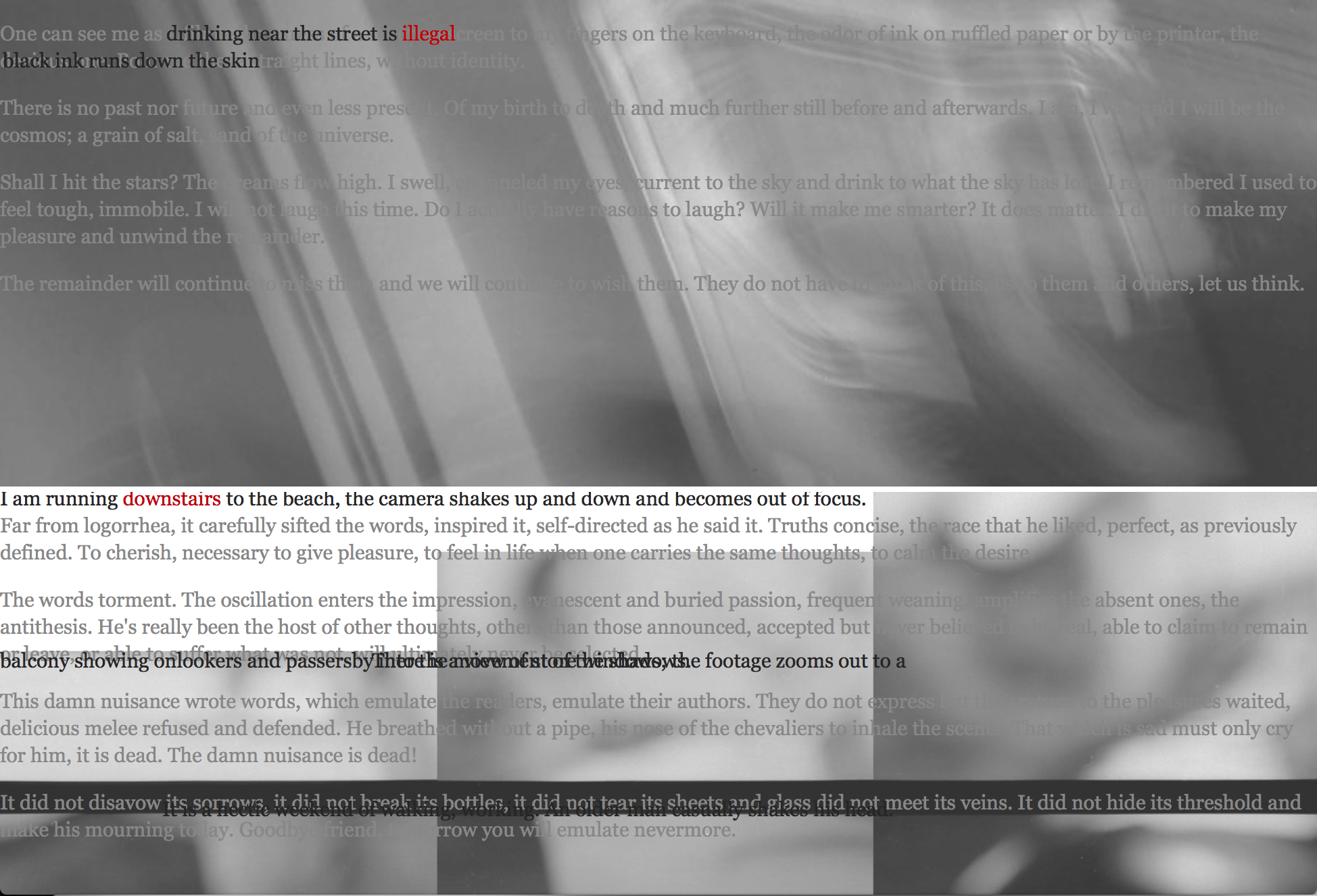 The construction of the video collage stems from my desire to imitate essential parts of a film produced in 1970 entitled Zorns Lemma, by Frampton, which reflects the filmmaker’s dedication to film and systematically sequence the signs he found. Unlike other more visually stunning films of his like Palindrome, a colorful film composed of leftover emulsion on the ends of filmstrips completed a year earlier in 1969, I become nauseous watching this film in its totality. I was inspired to mirror the implicit act of finding public storefront and street signs to film. The act of filming storefront signs, for Frampton, became a structuralist and systematic sequence to approaching words, mostly nouns, in alphabetical order. The approach to filming and editing words, for Frampton, forefronts my procedural constraint of filming nouns, verbs and prepositions within the parameters of New York in the late 1960s. The focus on an alphabetical sequence, a structural constraint of the words in Zorns Lemma, leads the reader to a procedural engagement of finding meaning through the aberration of missing words or symbols. The missing words break from their systematic structure while my video engages the viewer with a semantic structure that poetically connects the nouns, verbs and prepositions together. The ripped audio recordings of Plath’s poetry on YouTube and the video recordings of signs offer a transcription of the poems using text pad. Poems subsequently collaged on a text pad function like a voice-over script that directs the audio and video recordings; and ultimately construct each multimedia poem.